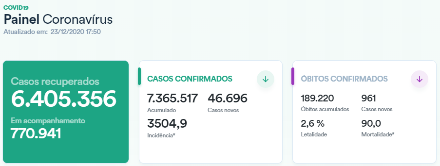 截至当地时间12月23日,根据巴西卫生部发布的数据,巴西全国新冠肺炎确诊病例累计7365517例,确诊病例比前一日新增46696例;累计死亡病例189220例,新增死亡病例961例,累计康复人数6405356人。