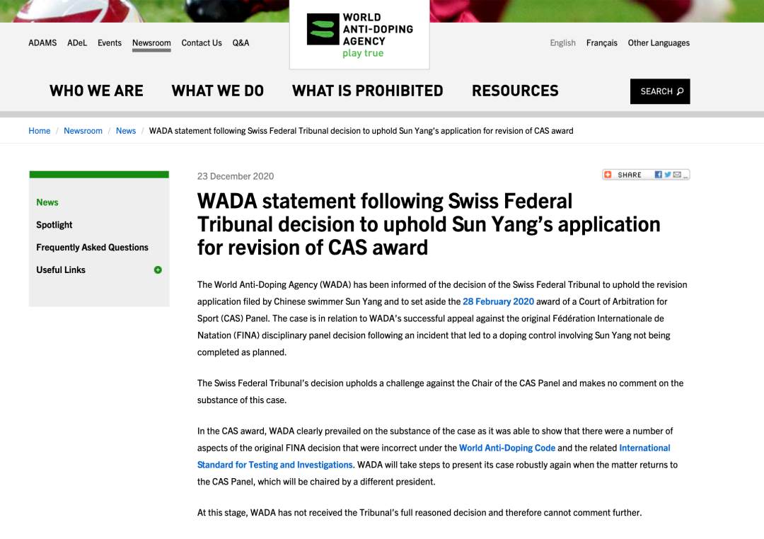 在得知瑞士最高法院撤销对孙杨的裁决后,WADA对此事发表声明称,已得知瑞士联邦最高法院支持孙杨对CAS判决的改判请求,会积极采取行动,在案件回到国际体育仲裁法庭后,继续陈述其立场。声明如下: