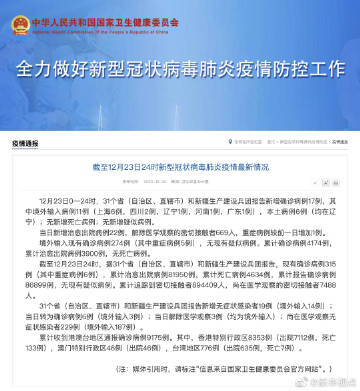 #严防疫情反弹#【国家卫健委:#23日新增确诊病例17例#】12月23日0—24时,31个省(自治区、直辖市)和新疆生产建设兵团报告新增确诊病例17例,其中境外输入病例11例(上海6例,四川2例,辽宁1例,河南1例,广东1例),本土病例6例(均在辽宁);无新增死亡病例;无新增疑似病例。