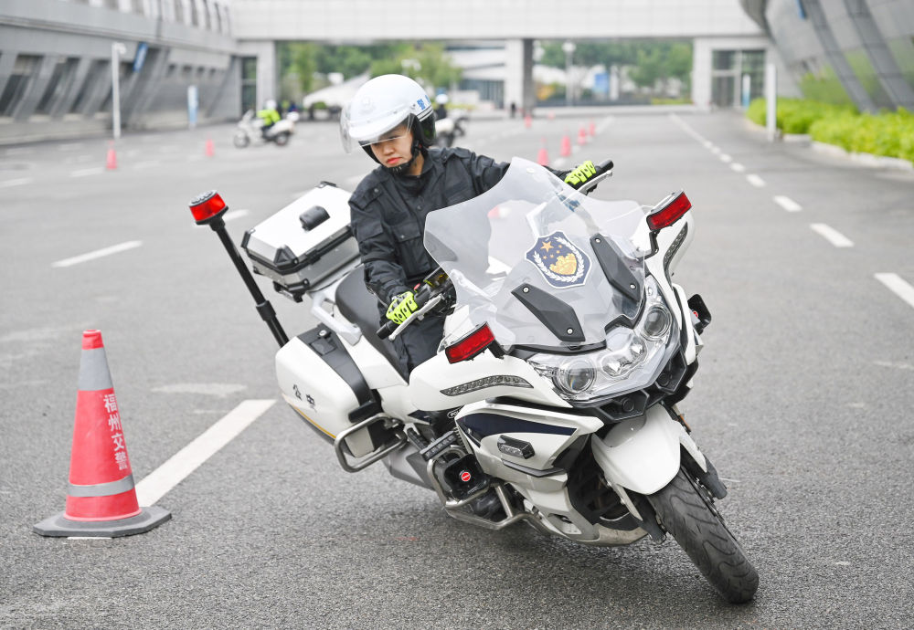 12月18日,福州交警女子骑警队队员向婷在训练“8字压弯”。