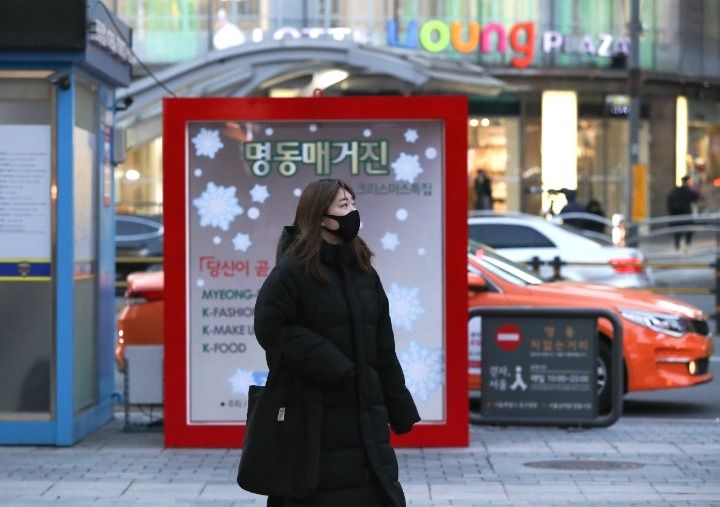 12月8日,一名戴口罩的女子在韩国首尔明洞逛街。新华社记者王婧嫱摄