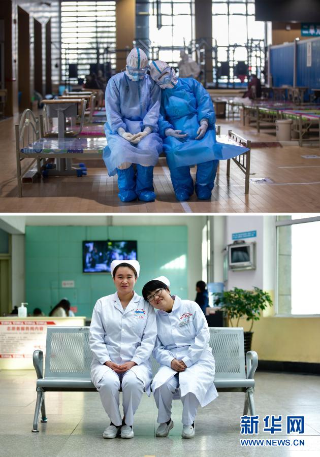 这是一张拼版照片,上图为:3月10日,青海医疗队队员刘海婷(左)与许国娟在武昌方舱医院等待出舱时小憩(新华社记者费茂华摄);下图为:12月16日,海东市第一人民医院内科护士刘海婷(左)与海东市第二人民医院眼科护士许国娟重逢时拍摄合影(新华社记者张龙摄)。
