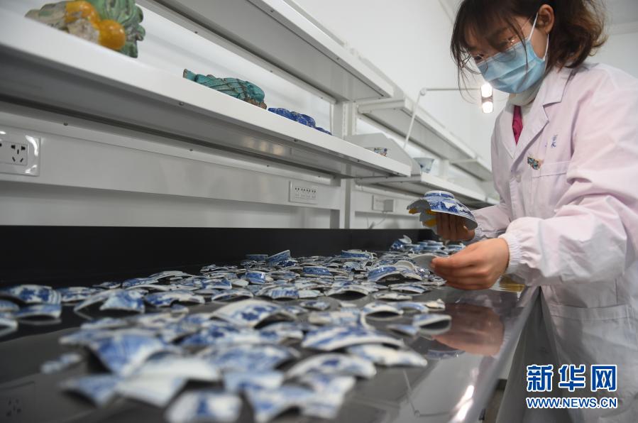 12月24日,在圆明园管理处考古工作站,工作人员在摆放已修复的瓷器。