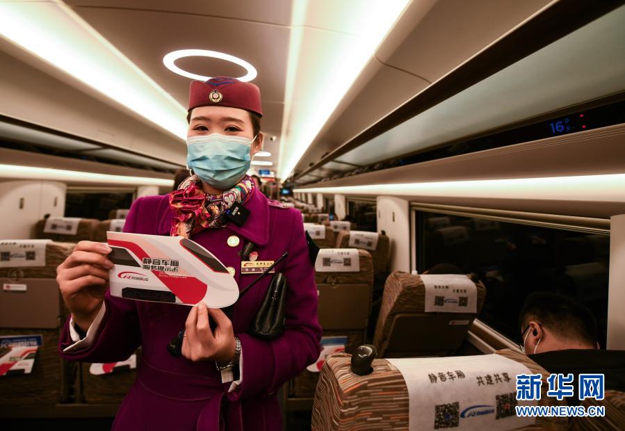 12月24日,在成渝高铁成都东至沙坪坝G8609次列车上,列车长李静展示“静音车厢”服务提示卡。