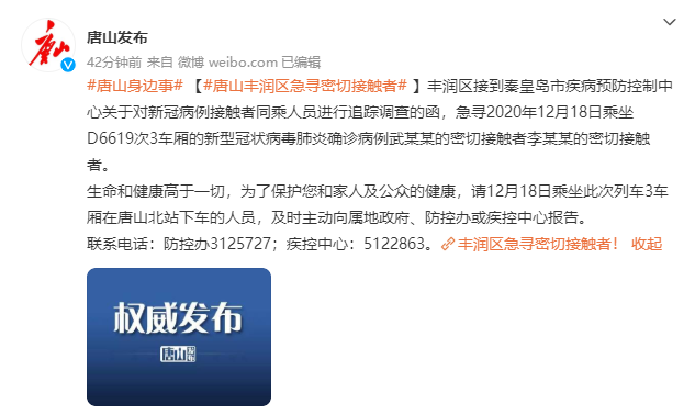 记者从唐山市人民政府新闻办公室官方微博获悉,河北唐山丰润区接到秦皇岛市疾病预防控制中心关于对新冠病例接触者同乘人员进行追踪调查的函,急寻2020年12月18日乘坐D6619次3车厢的新型冠状病毒肺炎确诊病例武某某的密切接触者李某某的密切接触者。