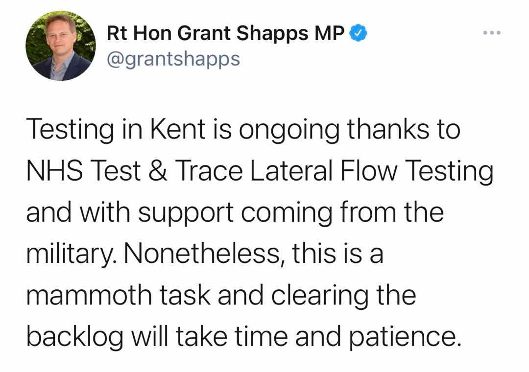 据英国广播公司(BBC)23日报道,英国已经组织士兵加入新冠病毒检测工作,但英国运输部长格兰特·沙普斯(Grant Shapps)在个人社交媒体表示,“这是一项艰巨的任务,但清理积压的工作需要时间和耐心”。23日晚间,已有少部分卡车司机得以离境,但是困在多佛的货车要想全部离开,需要花费数天时间。