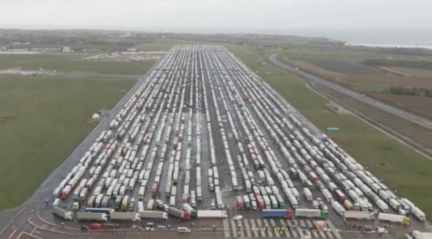 英国住房、社区与地方政府事务大臣罗伯特·詹里克说,估计至少4000辆货运卡车滞留在东南部肯特郡。英国公路运输协会则估计,滞留卡车多至一万辆。卡车司机们等待从英国多佛前往法国。英国广播公司(BBC)航拍画面显示,公路上的卡车一眼望不到头。多佛附近的一处废弃机场成为了3800辆卡车的停车场,还有另外1200辆卡车把多佛附近的公路给占满了。