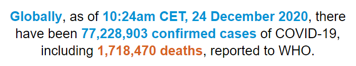 根据世卫组织最新实时统计数据,截至欧洲中部时间12月24日10时24分(北京时间12月24日17时24分),全球累计新冠肺炎确诊病例77228903例,累计死亡病例1718470例。(总台记者 朱赫)