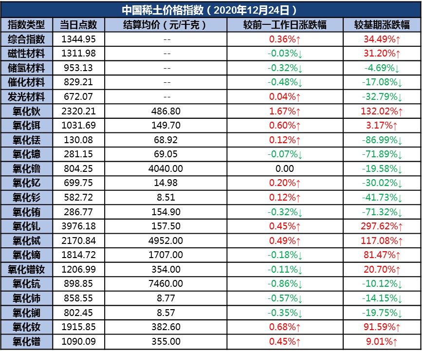 其中,氧化钬、氧化铒、氧化铥、氧化钇、氧化钐、氧化钆、氧化铽、氧化钕、氧化镨单品价格指数分别较前一工作日上涨;氧化镱、氧化铕、氧化镝、氧化镨钕、氧化钪、氧化铈、氧化镧单品价格指数分别较前一工作日下跌;氧化镥单品价格指数与前一工作日持平。