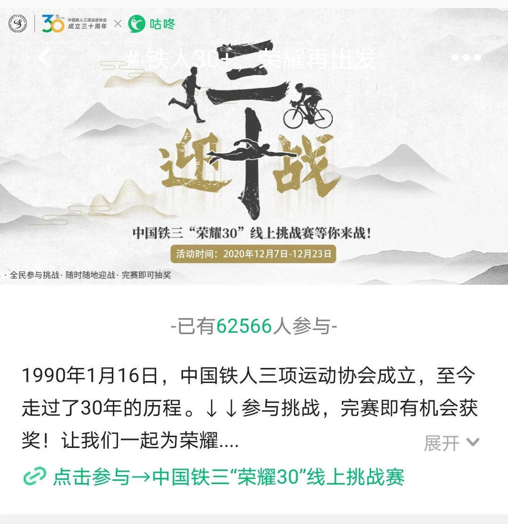 新华网北京12月24日电 为庆祝中国铁人三项运动协会成立30周年,中铁协联合华为运动健康APP和咕咚APP,发起了“中国铁三 致敬(荣耀)30”线上挑战赛。这项历时两周的线上赛于23日24点完赛,共吸引了590955人参加。