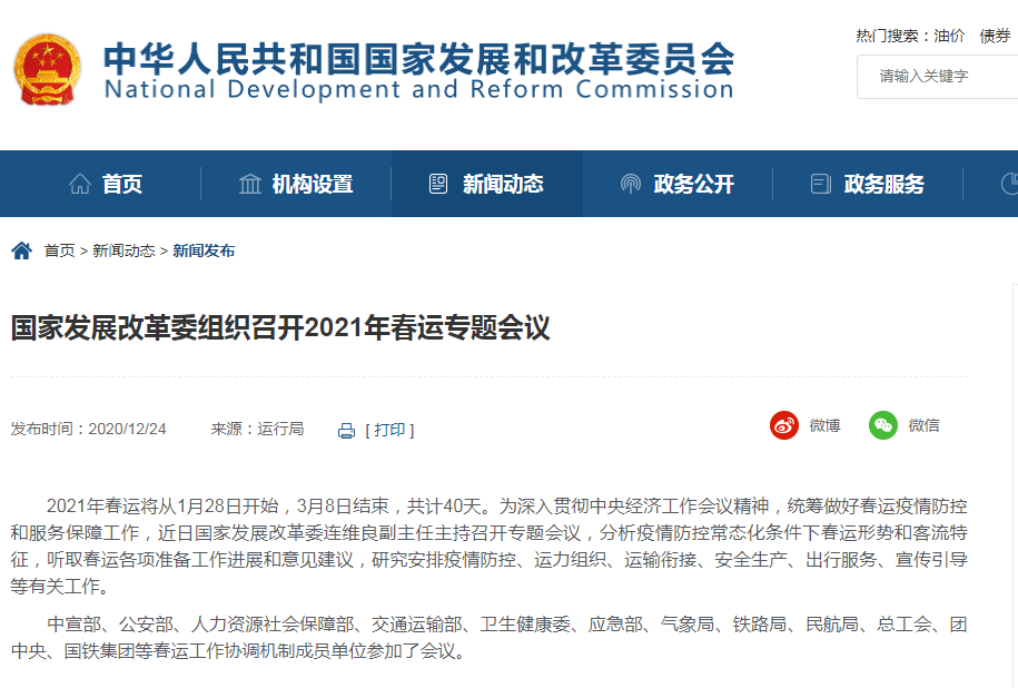 2021年春运将从1月28日开始,3月8日结束,共计40天。为深入贯彻中央经济工作会议精神,统筹做好春运疫情防控和服务保障工作,近日国家发展改革委连维良副主任主持召开专题会议,分析疫情防控常态化条件下春运形势和客流特征,听取春运各项准备工作进展和意见建议,研究安排疫情防控、运力组织、运输衔接、安全生产、出行服务、宣传引导等有关工作。详情>>>