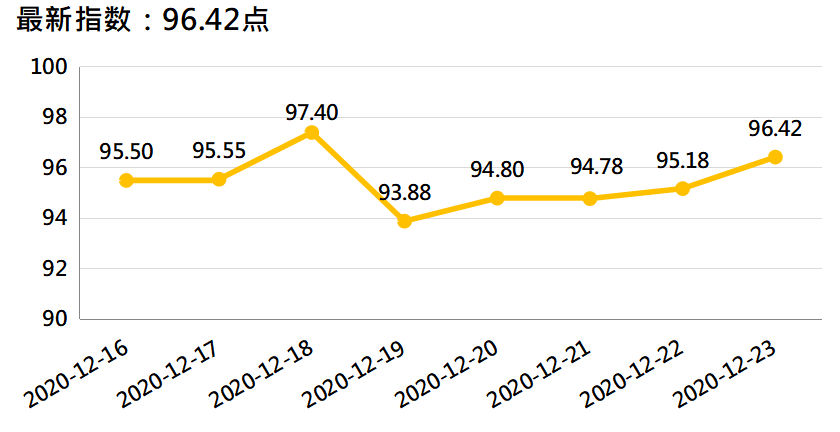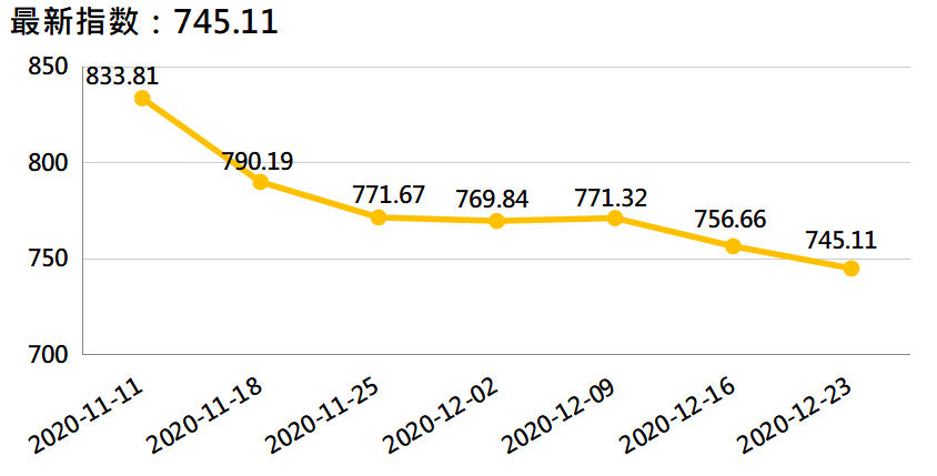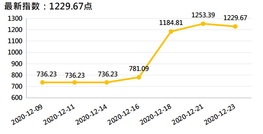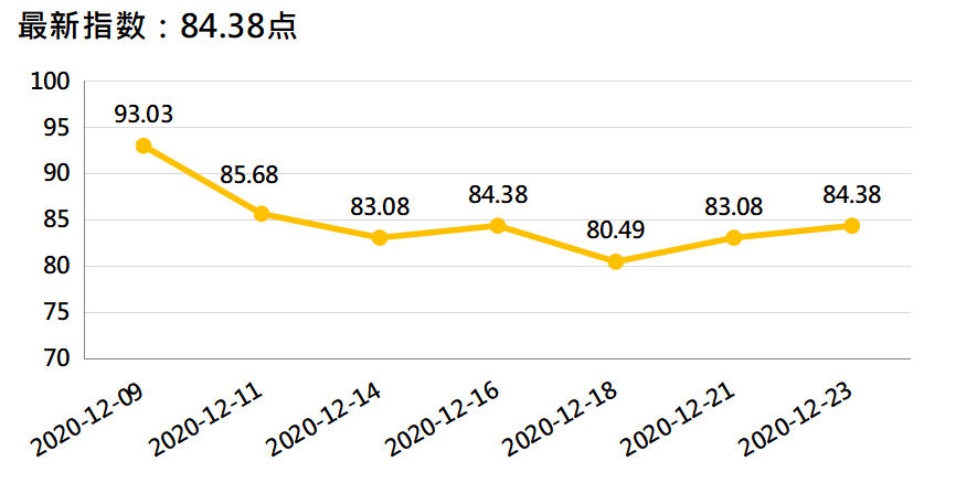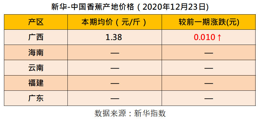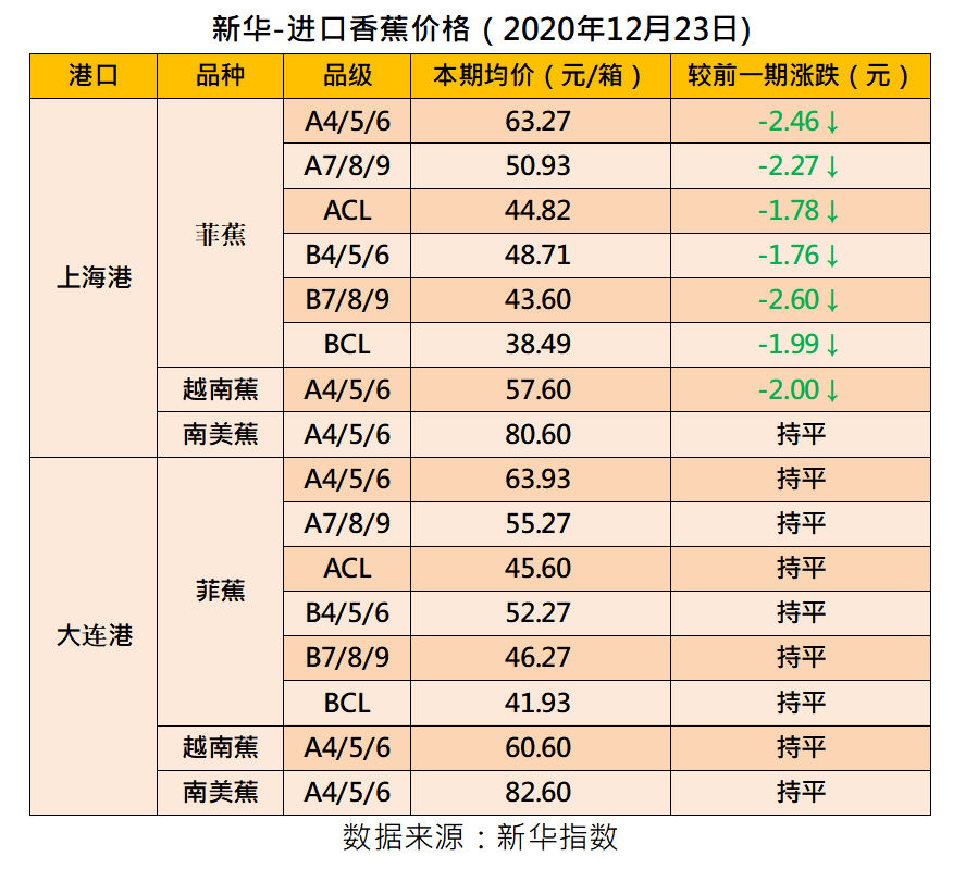 新华财经北京12月24日电(李水艳、李伯罧、薛志烜)新华-中国香蕉产业四大指数显示,截至2020年12月23日,国内香蕉产地价格指数报84.38点,较上一发布日(12月16日,下同)84.38点持平;香蕉销地批发价格指数报96.42点,较上一发布日95.50点上涨0.96%;进口蕉价格指数报745.11点,较上一发布日756.66点下跌1.53%;皇帝蕉产地价格指数报1229.67点,较上一发布日781.09点上涨57.43%。