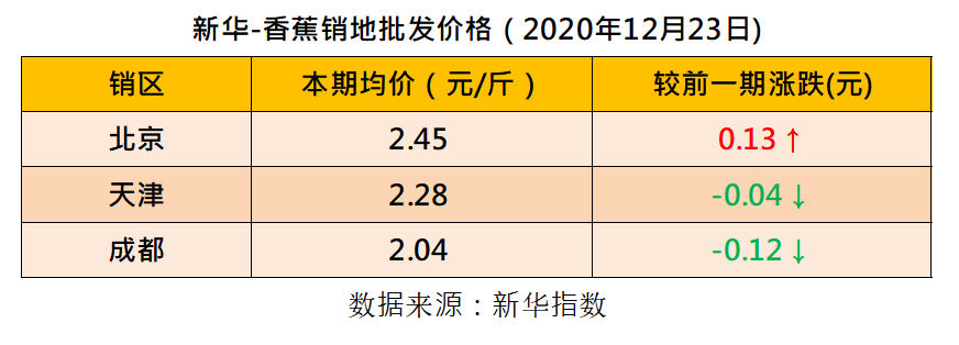 本监测期(12月17日-12月23日)内,皇帝蕉产地价格大幅上涨,据产地消息,当前海南主产区降温幅度较大,皇帝蕉成熟期延长,市场供应量减少,叠加元旦临近客商备货积极等因素影响,皇帝蕉价格短期内迅速上涨;销地批发市场方面,当前香蕉走货量总体较为稳定,本监测期内香蕉销地批发价格稳中有涨;进口蕉方面,当前进口蕉供过于求,价格承压、行情下滑。