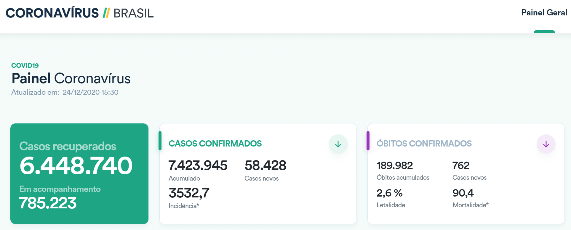 截至当地时间12月24日,巴西单日新增新冠肺炎确诊病例58428例,累计确诊7423945例,新增死亡病例762例,累计死亡189982人,累计治愈6448740人。
