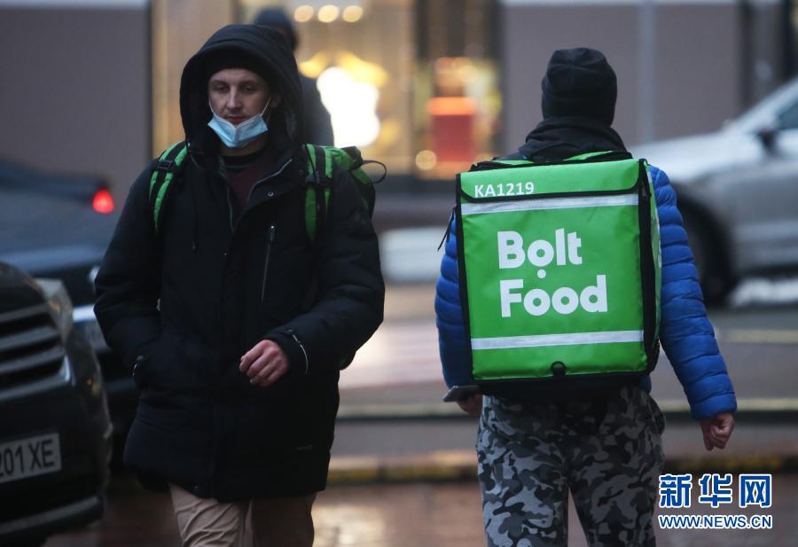 12月24日,在乌克兰基辅,一名外卖送餐员走在路上。