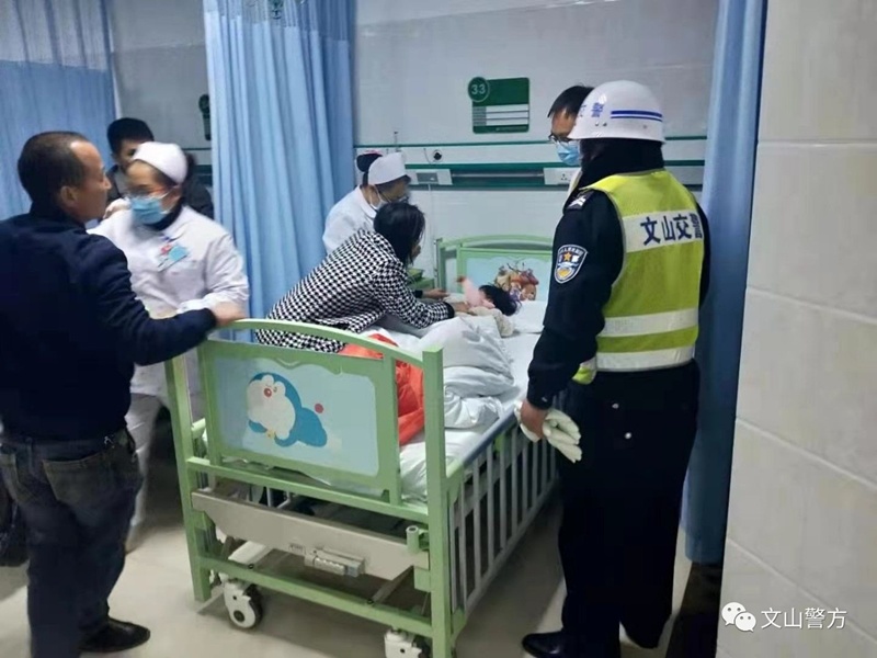 12月19日20点左右,云南省文山州文山市路面执勤交警接到一辆出租车上夫妻的求助,称自己3岁的孩子在家中烤碳火时中毒昏迷,急需赶往医院救治。