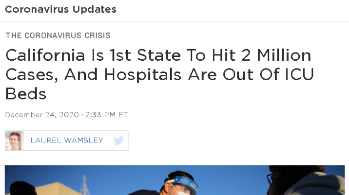 △NPR报道,加州是美国第一个累计病例数超过200万的州,而该州医院重症监护病房几乎饱和