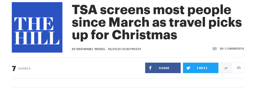 △《国会山报》报道,美国联邦运输安全管理局称,12月23日近120万人通过机场安检,创3月以来新高