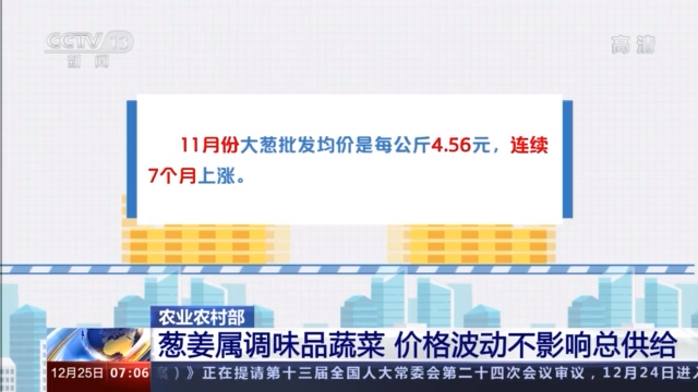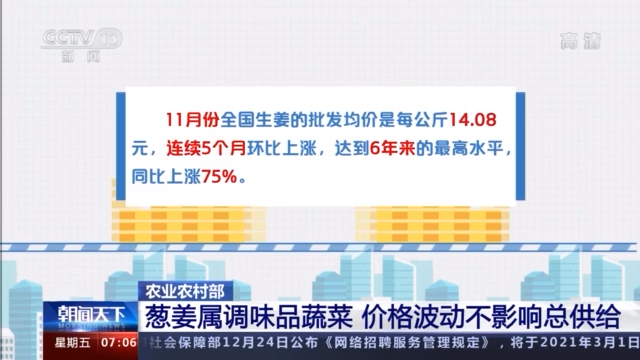 农业农村部市场与信息化司司长 唐珂:这轮葱姜价格上涨幅度较大,主要是因为前些年种植效益差导致面积下降,叠加不利天气影响,生产供应阶段性减少,总体上是市场供求规律发生作用的结果。