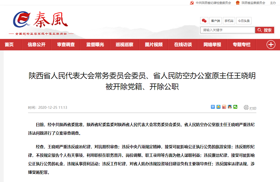 据陕西省纪委监委消息,日前,经中共陕西省委批准,陕西省纪委监委对陕西省人民代表大会常务委员会委员、省人民防空办公室原主任王晓明严重违纪违法问题进行了立案审查调查。