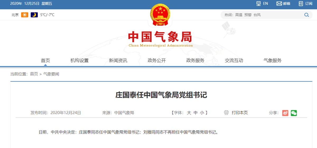 日前,中共中央决定:庄国泰同志任中国气象局党组书记;刘雅鸣同志不再担任中国气象局党组书记。
