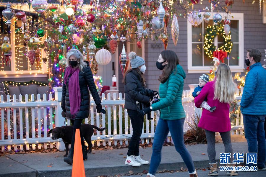 12月23日,人们在美国加利福尼亚州圣卡洛斯的社区观赏圣诞装饰。新华社发(李建国摄)