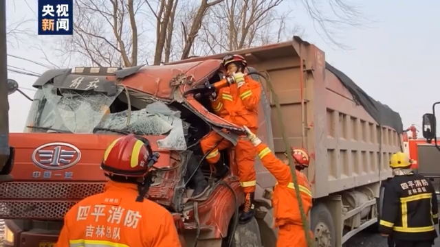救援人员到达现场后,发现大货车停在道路绿化带一侧,驾驶室前侧严重变形,货车驾驶员双腿被卡在仪表盘和驾驶座之间,呼吸困难。货车因遭受撞击,车体油管已经损坏开始漏油,营救工作刻不容缓。