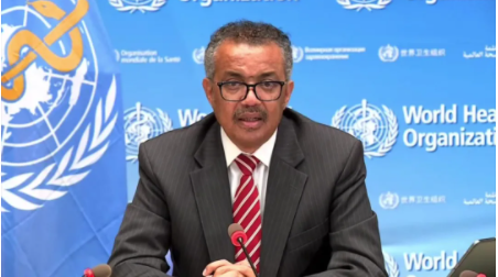 7月,世界卫生组织总干事谭德塞出席线上记者会。(视频截图)