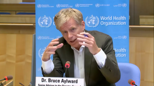 9月,世界卫生组织总干事高级顾问布鲁斯·艾尔沃德在记者会上回答新华社记者的线上提问。(视频截图)
