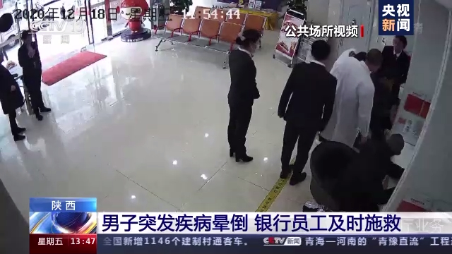 近日,在陕西旬阳一家银行的营业厅里,一位正在柜台前办理业务的男性客户突然晕倒。情急之下,银行的多名工作人员及时施救,直至急救人员到来。
