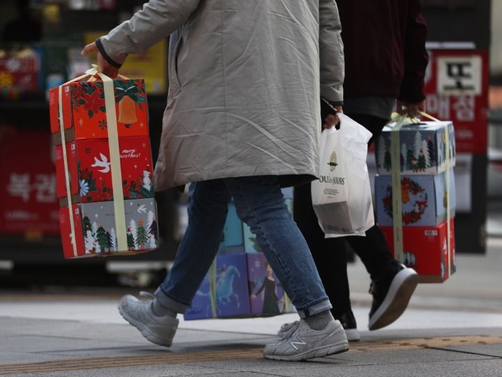 12月24日,在韩国首尔江南区,人们拿着圣诞蛋糕走在路上。新华社/欧新