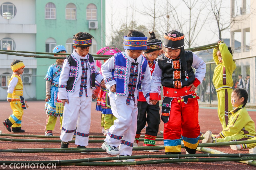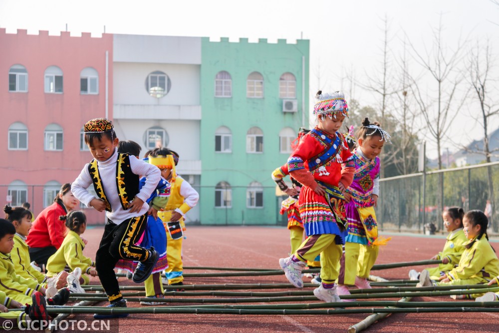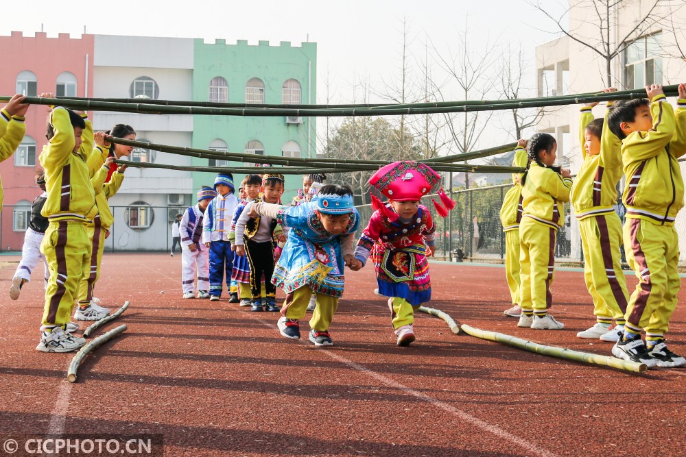 ↑浙江省湖州市长兴县洪桥镇中心幼儿园的孩子们在玩跳花竿游戏。CICPHOTO/许斌华 摄
