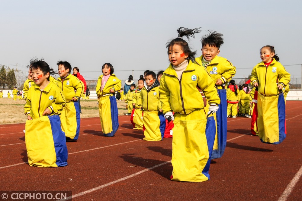 ↑浙江省湖州市长兴县洪桥镇中心幼儿园的孩子们在玩袋鼠跳游戏。CICPHOTO/许斌华 摄
