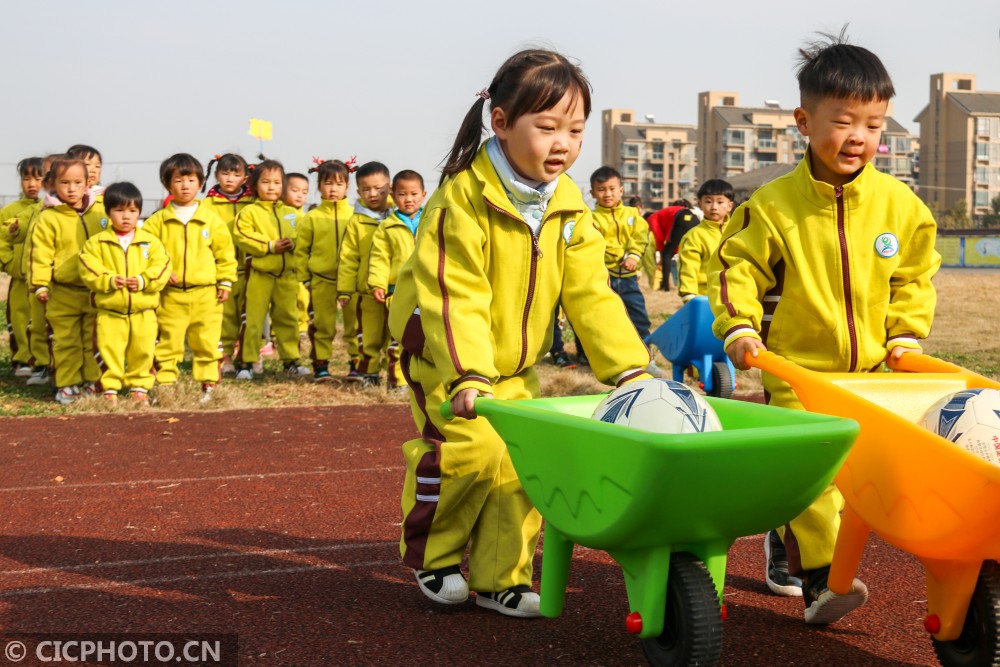↑浙江省湖州市长兴县洪桥镇中心幼儿园的孩子们在玩推小车游戏。CICPHOTO/许斌华 摄