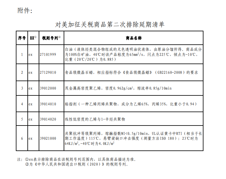 根据《国务院关税税则委员会关于第一批对美加征关税商品第二次排除清单的公告》(税委会公告〔2019〕8号),第一批对美加征关税商品第二次排除清单将于2020年12月25日到期。国务院关税税则委员会按程序决定,对上述商品延长排除期限。现将有关事项公告如下:
