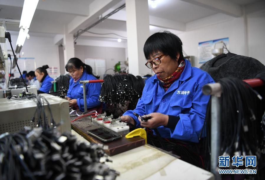 12月25日,工人在望都县望都镇北韩庄村一扶贫车间加工数据线缆。