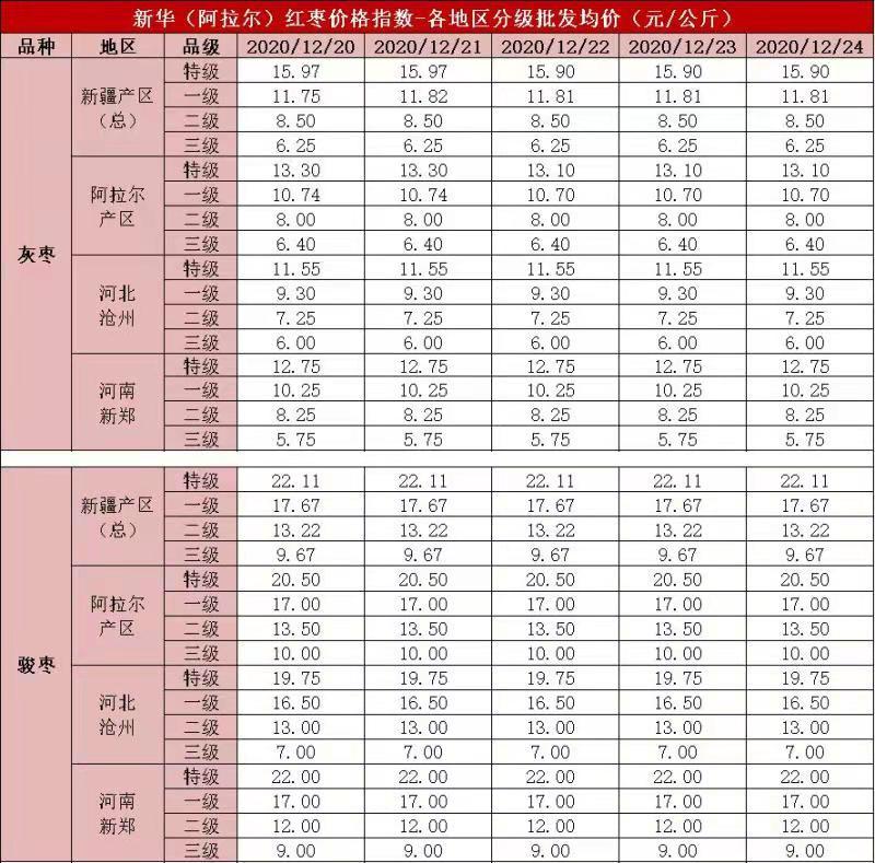 各地区灰枣、骏枣分级批发均价表