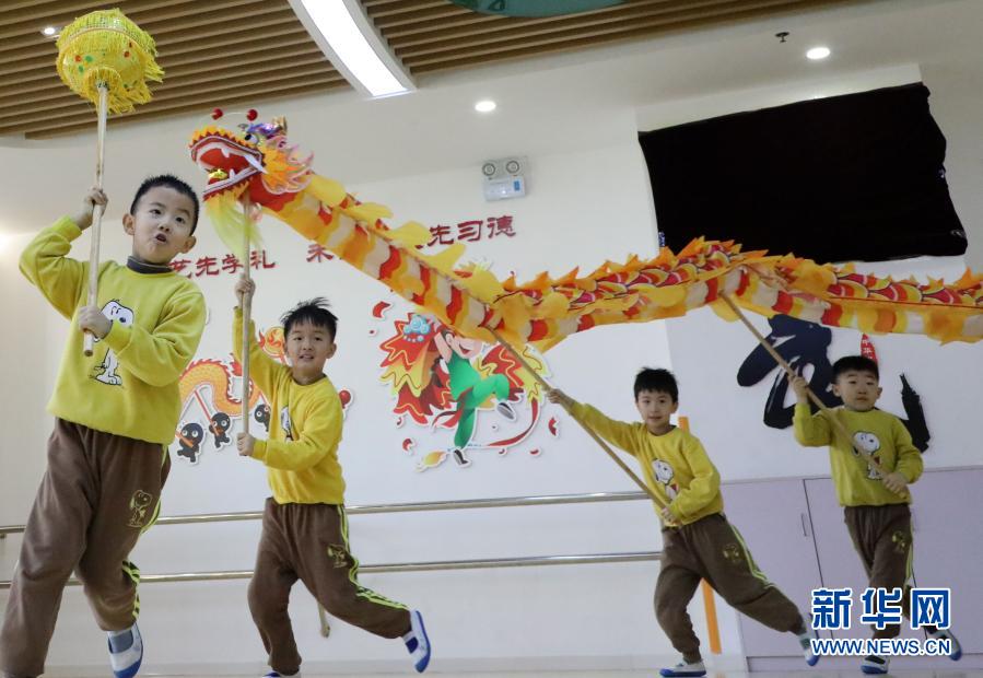 12月25日,幼儿园小朋友在练习舞龙。当日,山东省滨州市博兴县一家幼儿园开展“舞龙迎新年”活动,小朋友在专业老师带领下学习传统舞龙,迎接新年的到来。新华社发(陈彬 摄)