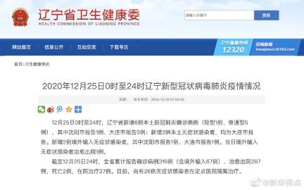 #严防疫情反弹# 【辽宁25日新增6例本土新冠肺炎确诊病例】12月25日0时至24时,辽宁省新增6例本土新冠肺炎确诊病例(轻型1例、普通型5例),其中沈阳市报告1例、大连市报告5例;新增2例本土无症状感染者,均为大连市报告。新增2例境外输入无症状感染者,其中沈阳市报告1例、大连市报告1例。当日境外输入无症状感染者治愈出院1例。