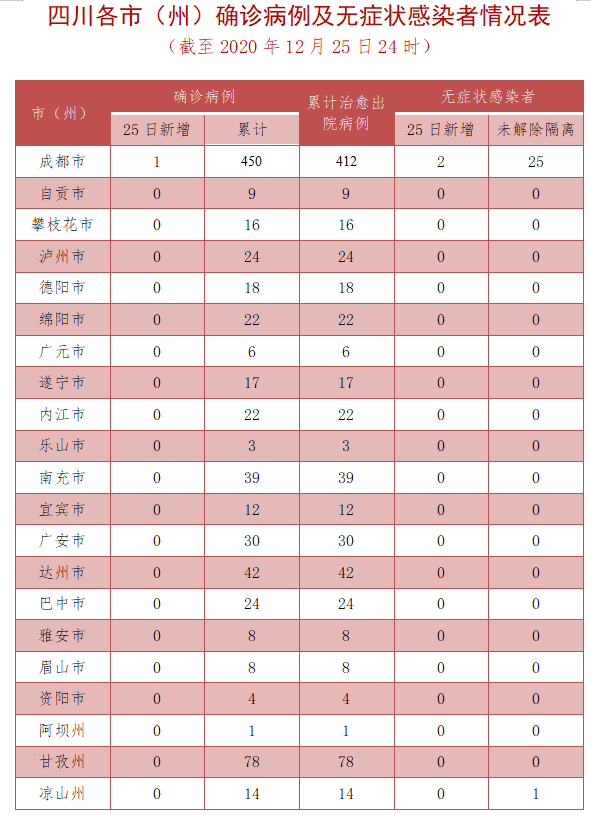 12月25日0—24时,四川新增新冠肺炎确诊病例1例,为境外输入,12月11日自埃及乘机抵蓉,12月25日确诊。新增治愈出院病例2例,无新增疑似病例,无新增死亡病例。
