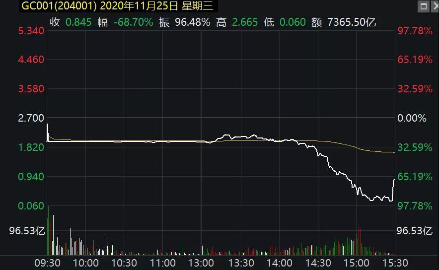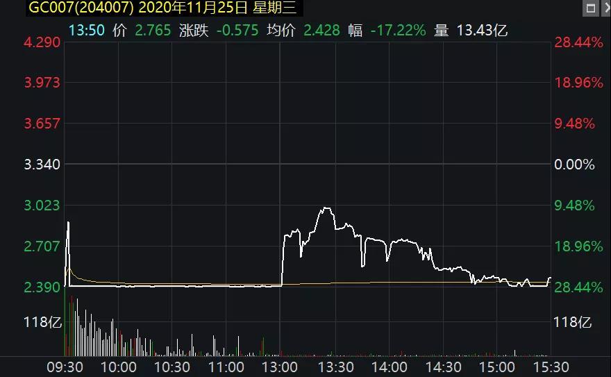 数据显示,11月25日,GC007成交量由前一日的1239.51亿元,激增至6229.52亿元。