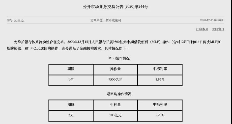 12月15日,人民银行开展9500亿元MLF操作,单次操作量再创历史新高,比当月到期量多3500亿元。