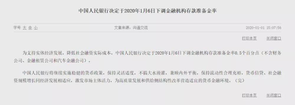 1月1日下午,央行表示将于1月6日下调金融机构存款准备金率0.5个百分点(不含财务公司、金融租赁公司和汽车金融公司)。