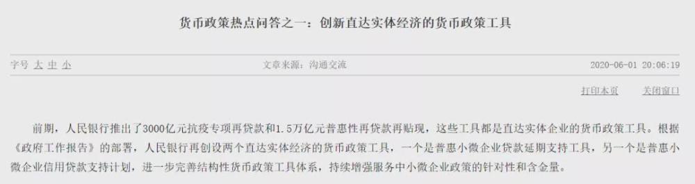 6月1日,央行新创设两个直达实体经济的货币政策工具:普惠小微企业贷款延期支持工具,普惠小微企业信用贷款支持计划。