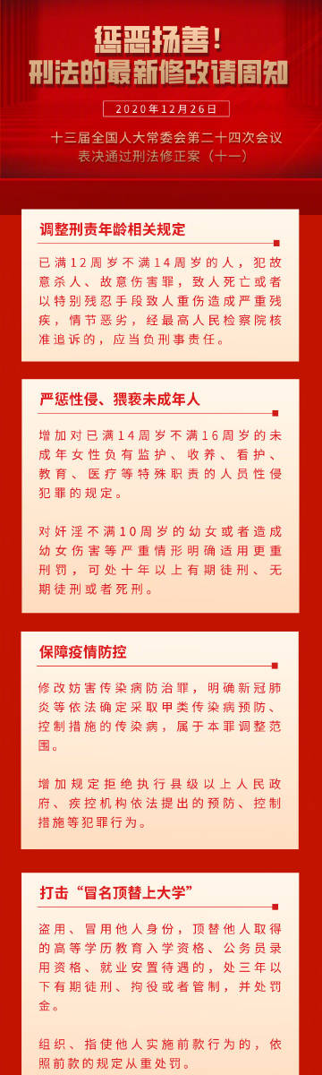 【一图速览|惩恶扬善!#刑法的最新修改#请周知】十三届全国人大常委会第二十四次会议26日表决通过刑法修正案(十一)