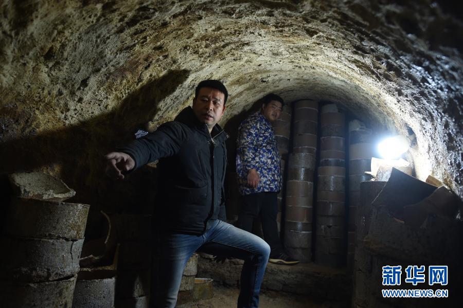 周明平(前)和烧窑师傅周鹤年在陈家窑内商讨匣钵的具体摆放位置(12月25日摄)。