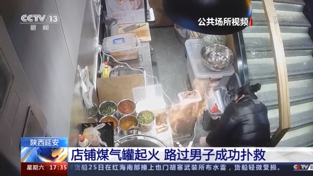 12月18日,在陕西延安中心街的一家小吃店,液化气罐突然漏气引发火灾。当店员和顾客纷纷跑向店外的时候,一名路过的男子逆行冲进店铺内,找到灭火器扑灭大火。从男子进店到火被扑灭,前后不到两分钟。