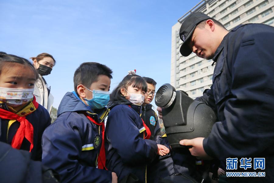 12月26日,淮北市的小朋友在参观警用排爆头盔。当日,安徽省淮北市公安局举行警营开放日活动,邀请市民走进警营参观互动,活动内容包括警务装备展示、警务技能现场演练、安全防范知识宣传和趣味知识竞答等。新华社发(万善朝 摄)