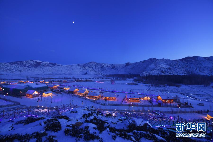这是12月25日拍摄的塔拉特村景色。新疆阿勒泰地区富蕴县可可托海镇塔拉特村位于额尔齐斯河源头附近,被誉为“额河第一村”。冬季夜幕中的塔拉特村,在灯光的映衬下如同冰雪童话世界。新华社记者 沙达提 摄