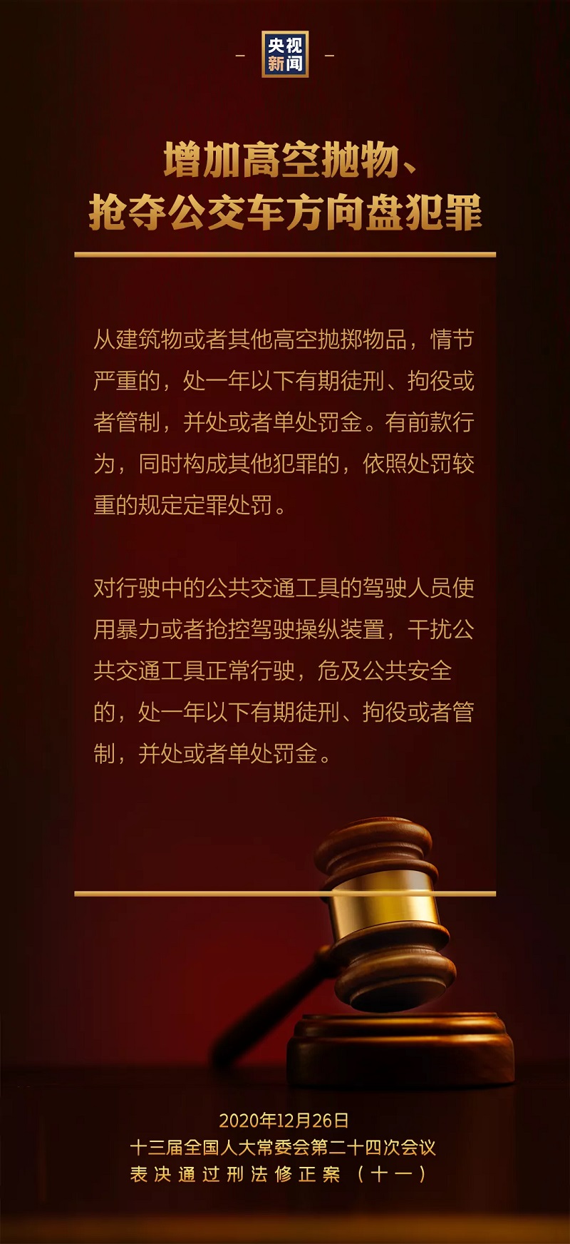 26日,十三届全国人大常委会第二十四次会议表决通过刑法修正案(十一),将于2021年3月1日起施行。刑法修正案(十一)新增条文13条,修改条文34条。包括哪些重要内容?对此,主播宝晓峰有话说。戳视频↓↓↓